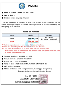 Đây là chi phí học tập chính, thường được các trường đại học Hàn Quốc quy định rõ trong invoice, tính theo từng kỳ hoặc theo năm học. Một năm tại Hàn thường có 4 kỳ, thông tin chi tiết sẽ được giới thiệu cụ thể trong invoice hoặc trên trang chủ của trường để sinh viên dễ dàng theo dõi và chuẩn bị tài chính.